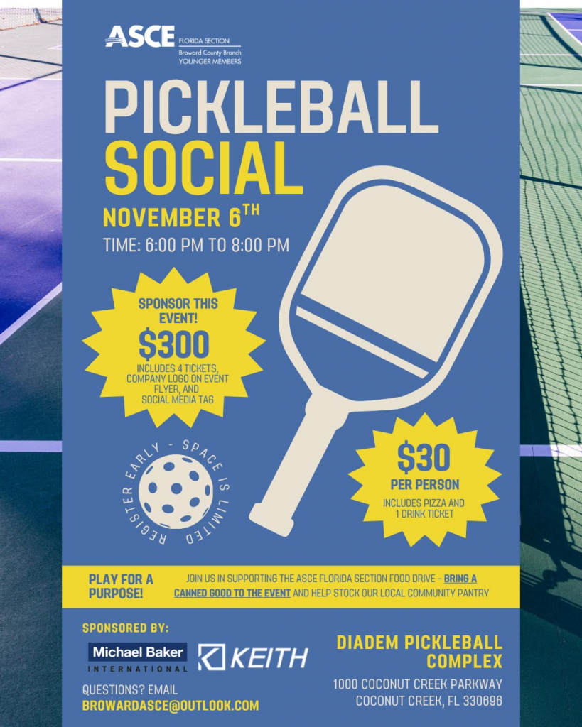 Join us for an exciting YMG pickleball social! We will not only be playing but also serving the community by collecting canned goods for our @asceflorida food drive. This is a fantastic opportunity to network with fellow civil engineering professionals while making a positive impact. Let’s rally together to make a difference!