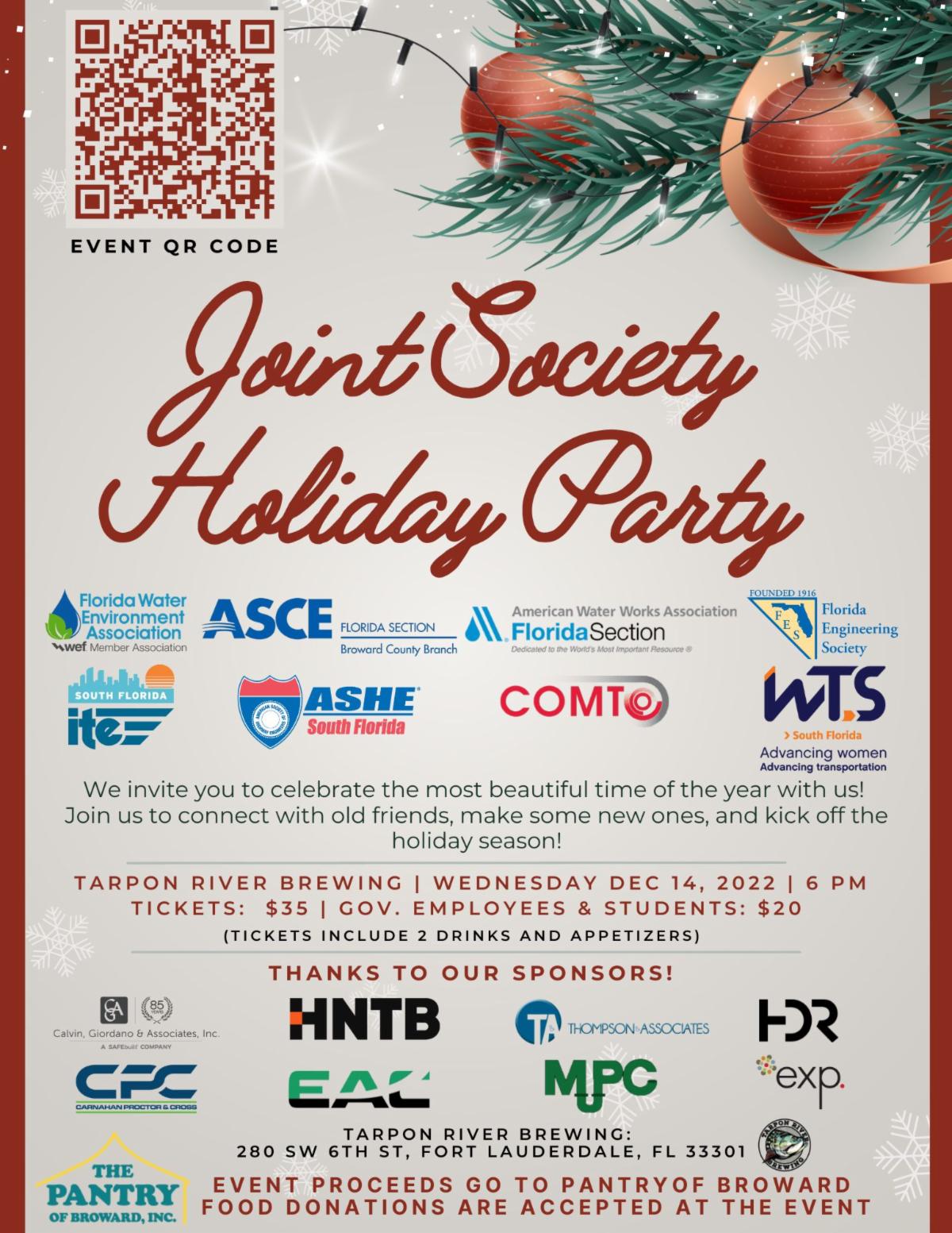 The Broward Joint Society Holiday Party is back! Please come out to Tarpon River Brewing on December 14th at 6:00 pm. Members from ASCE, ASHE, COMTO, FES, FWEA, FSAWWA, SFLITE, SFWTS, and DBIA will all be in attendance. The event also features a raffle and a canned food drive to get you into the spirit of the holidays. We hope to see you there!