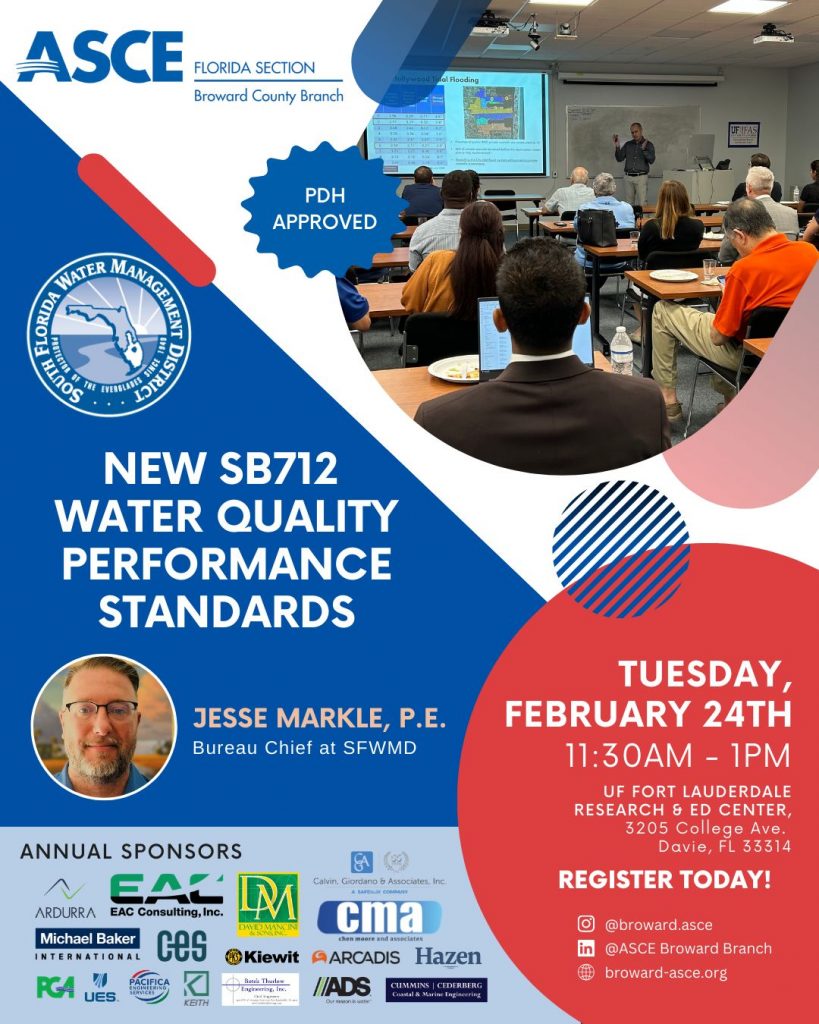 Join the ASCE Broward Branch for an insightful Lunch & Learn session on the NEW SB712 Water Quality Performance Standards. This technical presentation will cover updates to the Environmental Resource Permit Applicant’s Handbook Volumes I and II related to water quality performance standards for stormwater management systems implemented under Senate Bill 712 (2024), including design examples for single family, multi family, commercial, and roadway projects.🥤